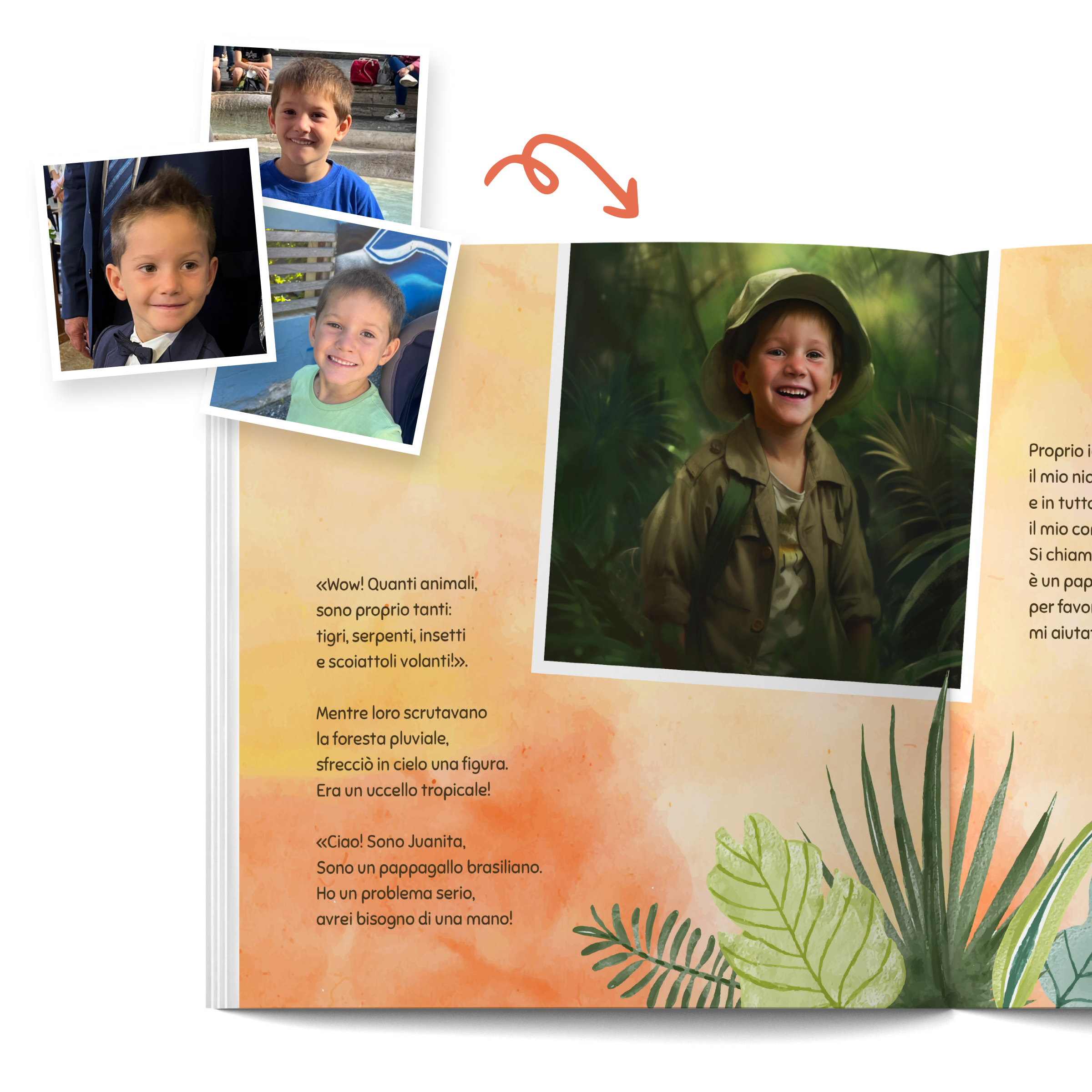 Dopo l'acquisto, carica le foto del tuo bambino così possiamo convertirle in una bellissima storia.